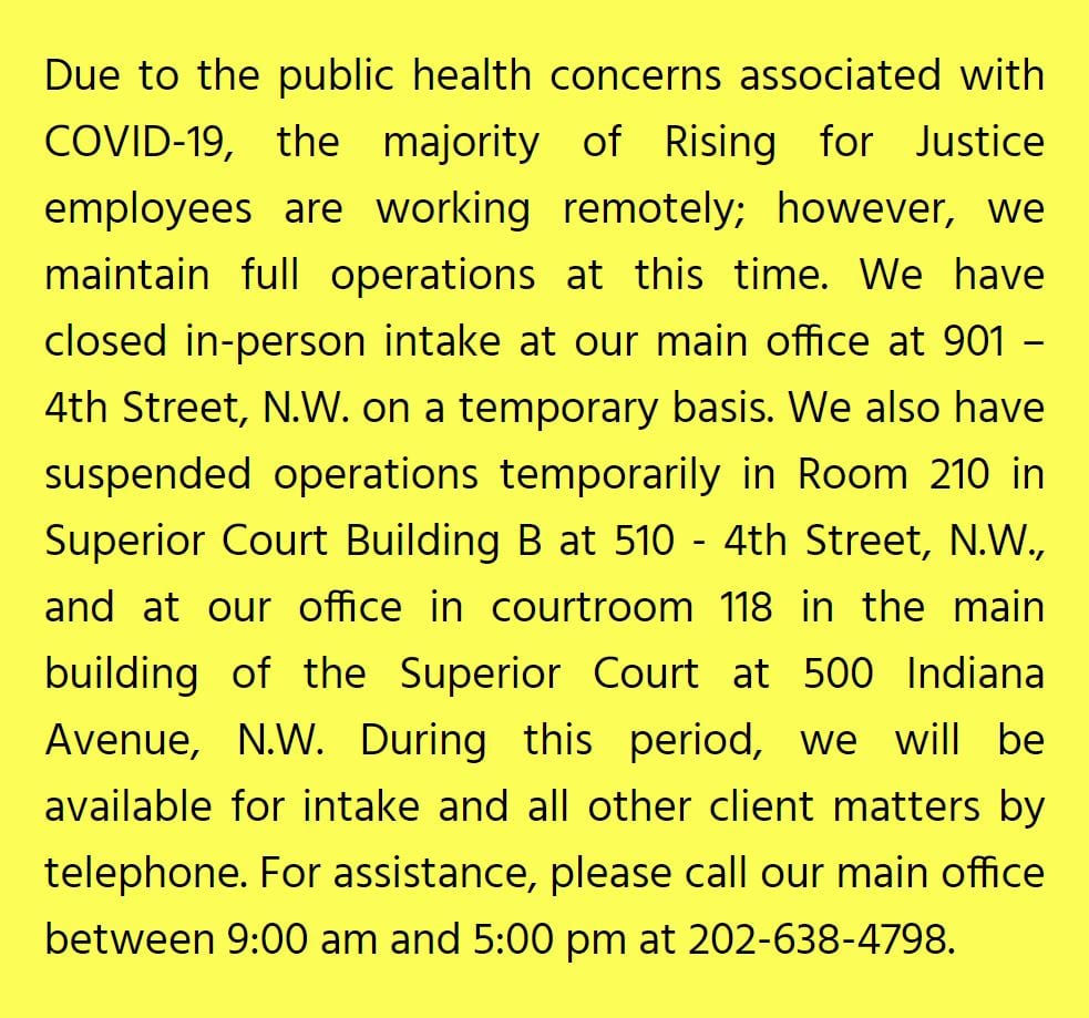 Rising for Justice (formerly DC Law Students in Court) is a nationally recognized leader at training social justice advocates and representing clients in grave legal jeopardy in the District of Columbia. We make justice a reality for vulnerable District residents via free, high-quality attorney and law student representation, and our wrap-around social work services create long-lasting outcomes for our clients. Since our founding over 50 years ago, we have protected the rights of more than 250,000 District residents and trained over 4,000 students through our law school clinic programs.